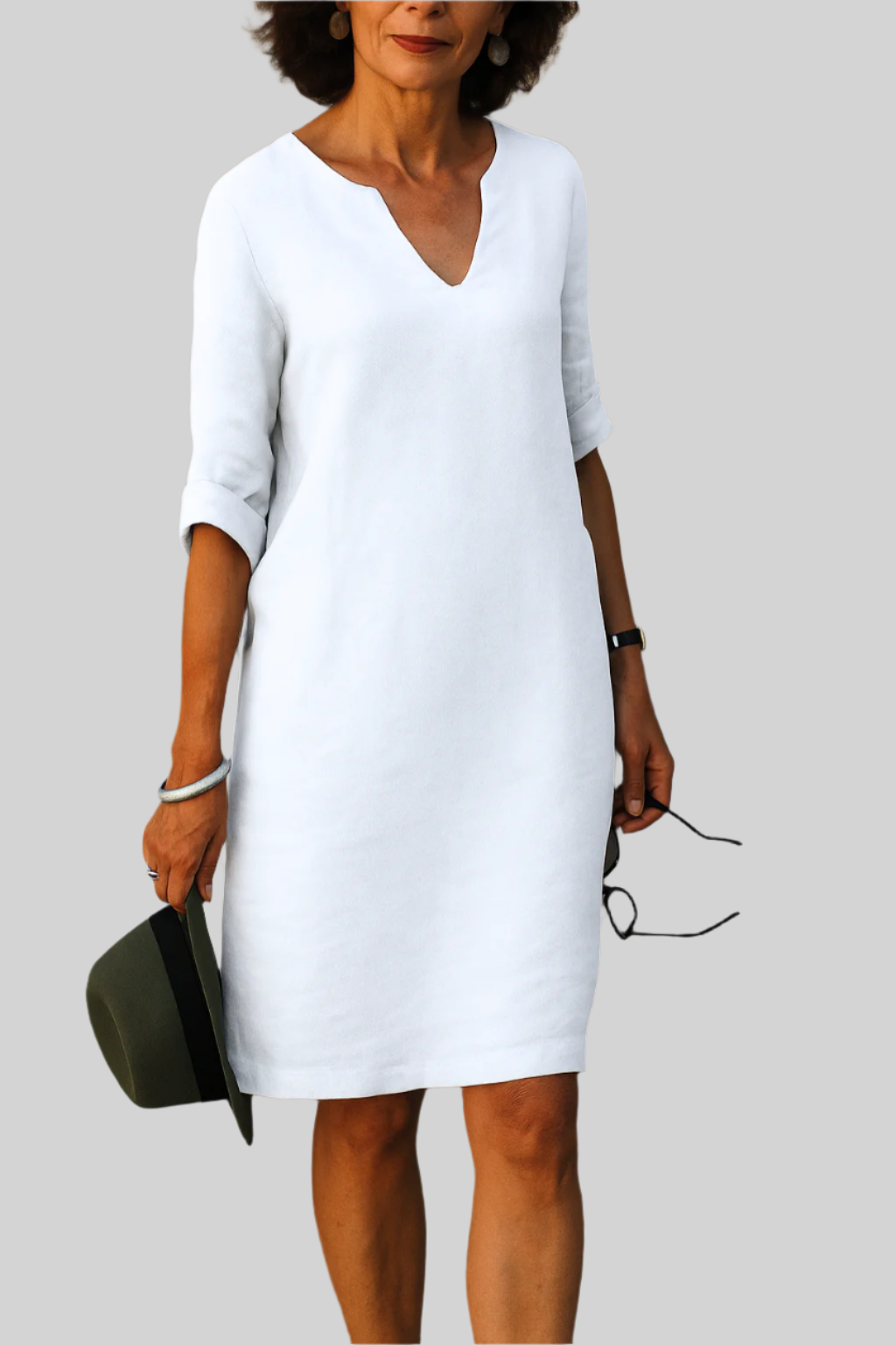 The Elina Charm Maxi Dress is where timeless sophistication meets everyday ease. This dress features a minimalist silhouette with a refined V-neckline, soft rolled sleeves, and a gently draped fit that flatters every figure. Whether you're exploring cobblestone streets, attending a casual dinner, or enjoying a slow weekend morning, this dress brings calm confidence and versatile charm—with pockets to make life simpler.